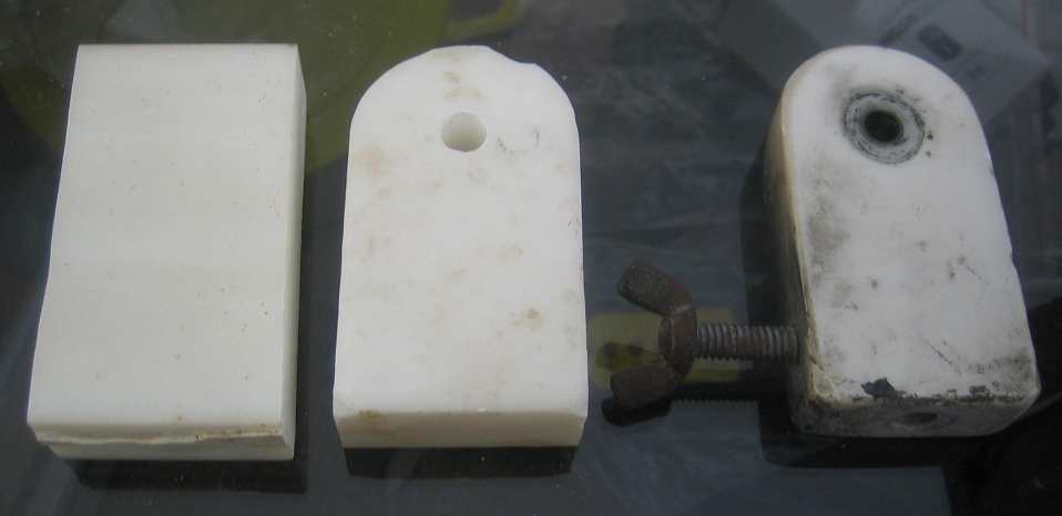 I have a drill press, tap, belt sander, and bench grinder. Am attaching a photo of the part itself, a partially shaped blank (1 of 1 on hand), and a rectangular blank.